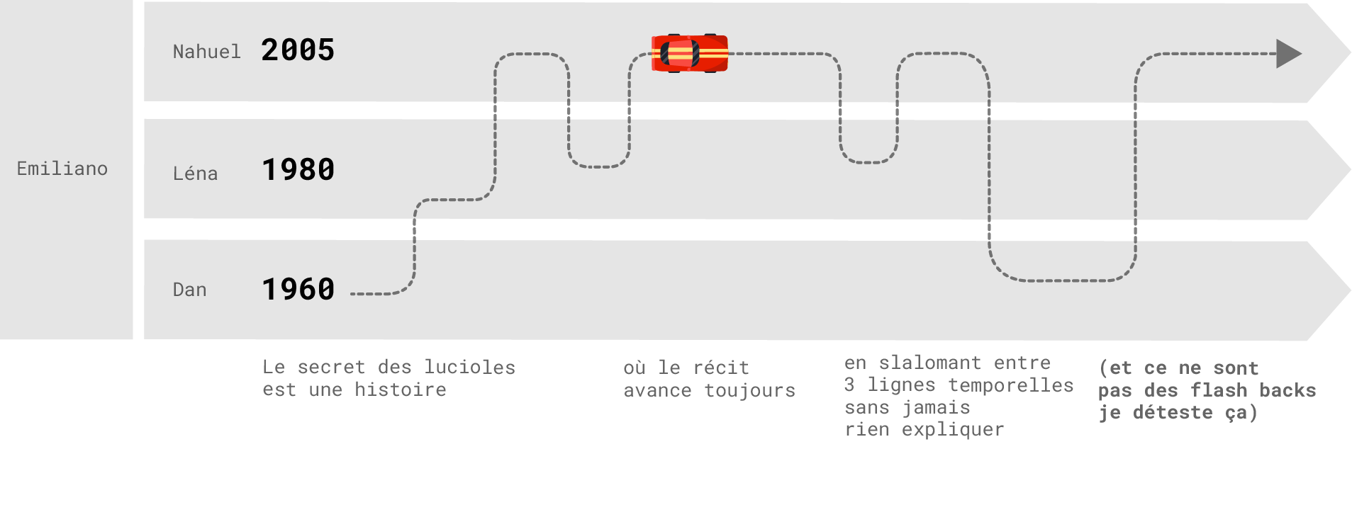 Le Secret des Lucioles est une histoire chorale construite autour de trois lignes temporelles (celles de Dan, Léna et Nahuel) qui s’entrelacent pour raconter une seule histoire : celle de la transmission invisible. Un récit qui repose sur un geste simple mais fondamental : voir autrement. Voir ce qu’on ne regarde plus. Ce qu’on n’a pas appris à nommer. Un carnet, un voyage, une disparition, une enquête : derrière ces éléments narratifs se cache un cheminement plus profond, où chaque personnage doit traverser le deuil, la mémoire, la filiation et l’effacement, pour rejoindre une forme de lumière intérieure. Entre monde tangible et perception altérée, cette histoire propose une expérience où le réel s’élargit peu à peu, jusqu’à devenir poreux. C’est une fable douce et grave à la fois, une traversée sensorielle qui questionne nos héritages, notre rapport au vivant, et ce que nous laissons derrière nous, sans jamais poser de certitudes.